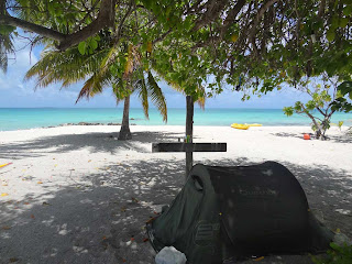 J'ai continué en vélo, prenant mon temps pour explorer. Je me suis arrêté à midi dans un snack pour commander un sandwich au frometon et des frites. J'ai pris mon temps, lisant des magazines tahitiens qui traînaient. Le temps n'existe plus, je me laisse porter par le vent, c’est jouissif ! Au bout de l'île, côté ouest, il y a de petits bancs de sable rose, que j'ai essayé de franchir pour arriver sur le motu en face mais un moment il y a un petit chenal où il n'y a plus pied. J'ai été obligé de renoncer. A cet endroit il y a un banc de sable rose minuscule, de 2 mètres sur 2, en forme de cœur. C'est merveilleux !